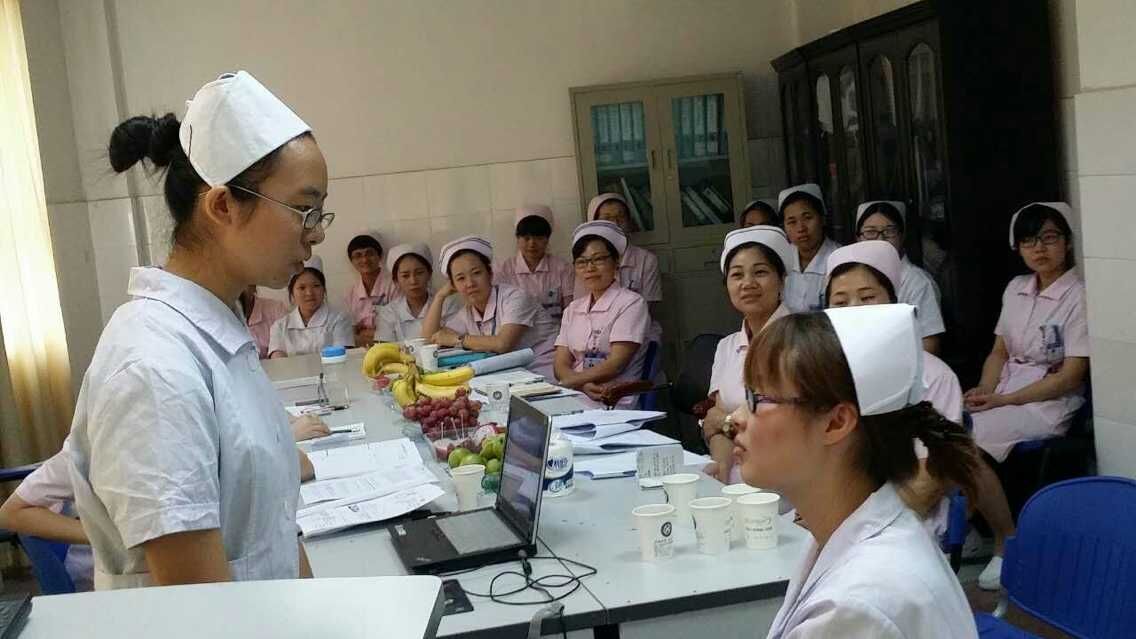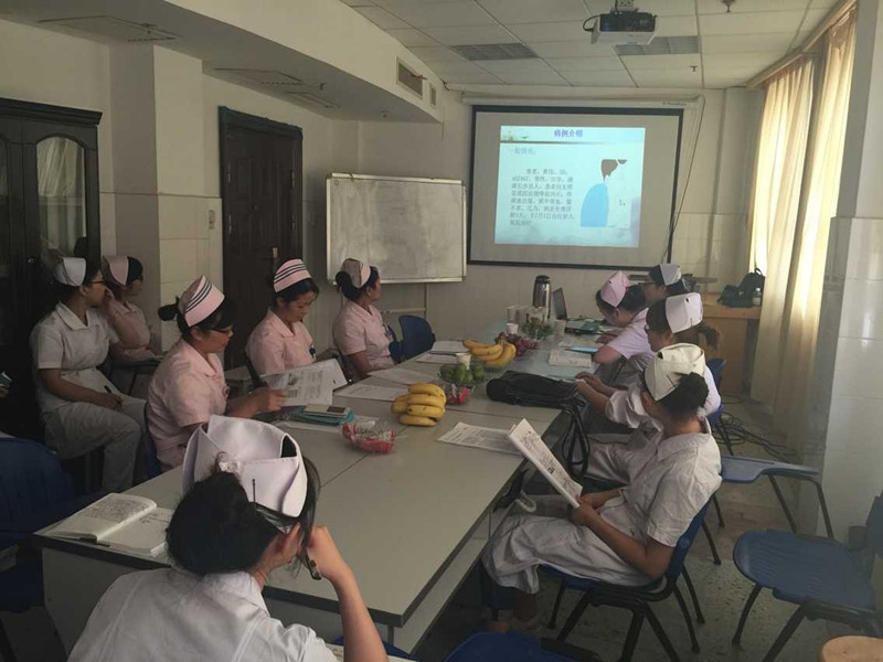 查房开始由周钰琼老师进行了背景、目标分析;长沙医学院实习护士汤壹婷同学进行病例介绍;十病区教学老师兼责任护士李敏提出了护理诊断与护理措施,并进行了现场提问与互动;中南大学湘雅护理学院的徐怡君和谢婉莹两位同学进行了“肺肾综合征”疾病相关知识的回顾与学习,教学组长周钰琼老师进行了“血浆置换术”的讲解。整个教学过程流畅、生动、内容丰富。两组实习护士的精彩表现赢得了大家一阵阵掌声,特别是徐怡君和谢婉莹两位同学采用情景模拟方式进行出院指导的环节,将本次现场教学的气氛推向了高潮,这种新颖的演示模式也得到了大家的一致赞扬。教学结束后,老师们针对本次查房进行总结,对本组实习护生表现出的大方得体、团结协作精神风貌进行表扬,也对部分内容提出了改进意见,同时也希望带教老师在以后的教学过程中,能为护生提供更多这样的具有专科特色的典型病例的学习机会。