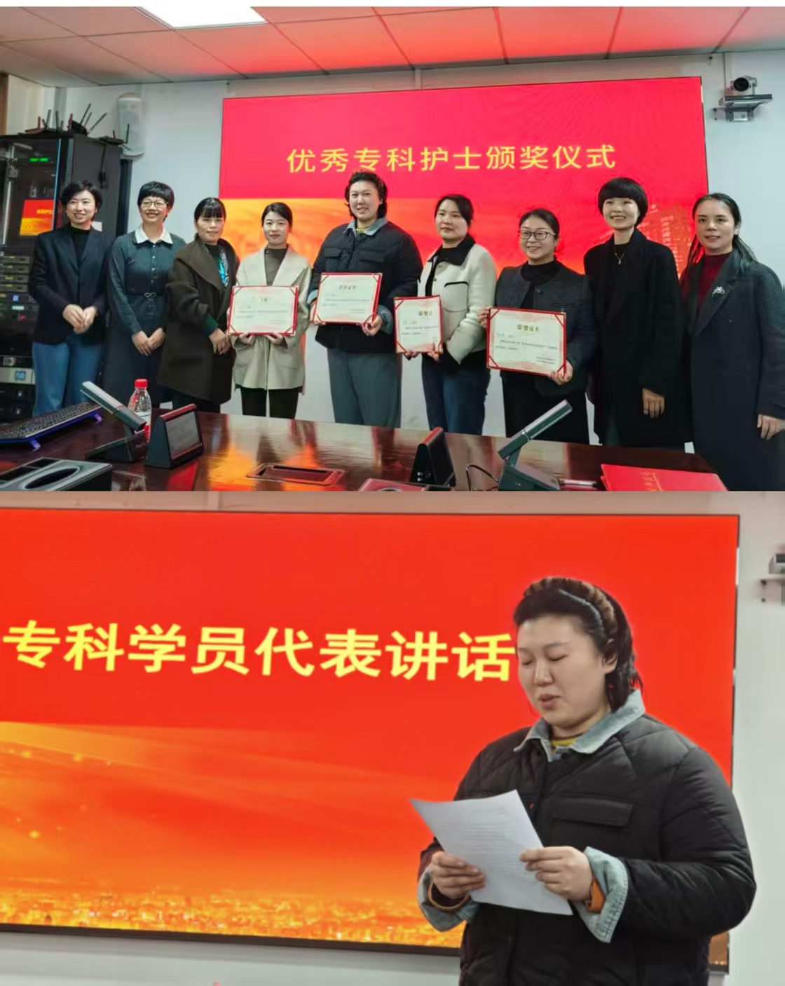 随后,妇科护士长张小红宣读表彰决定。本次评选综合理论考核、操作技能、临床实践及个案汇报等多维度表现,最终评定10 名学员分获 “优秀专科护士”“学习标兵” 荣誉称号。现场嘉宾为获奖学员颁发证书,勉励大家以荣誉为起点,发挥示范引领作用,在专科领域持续精进、深耕不辍。