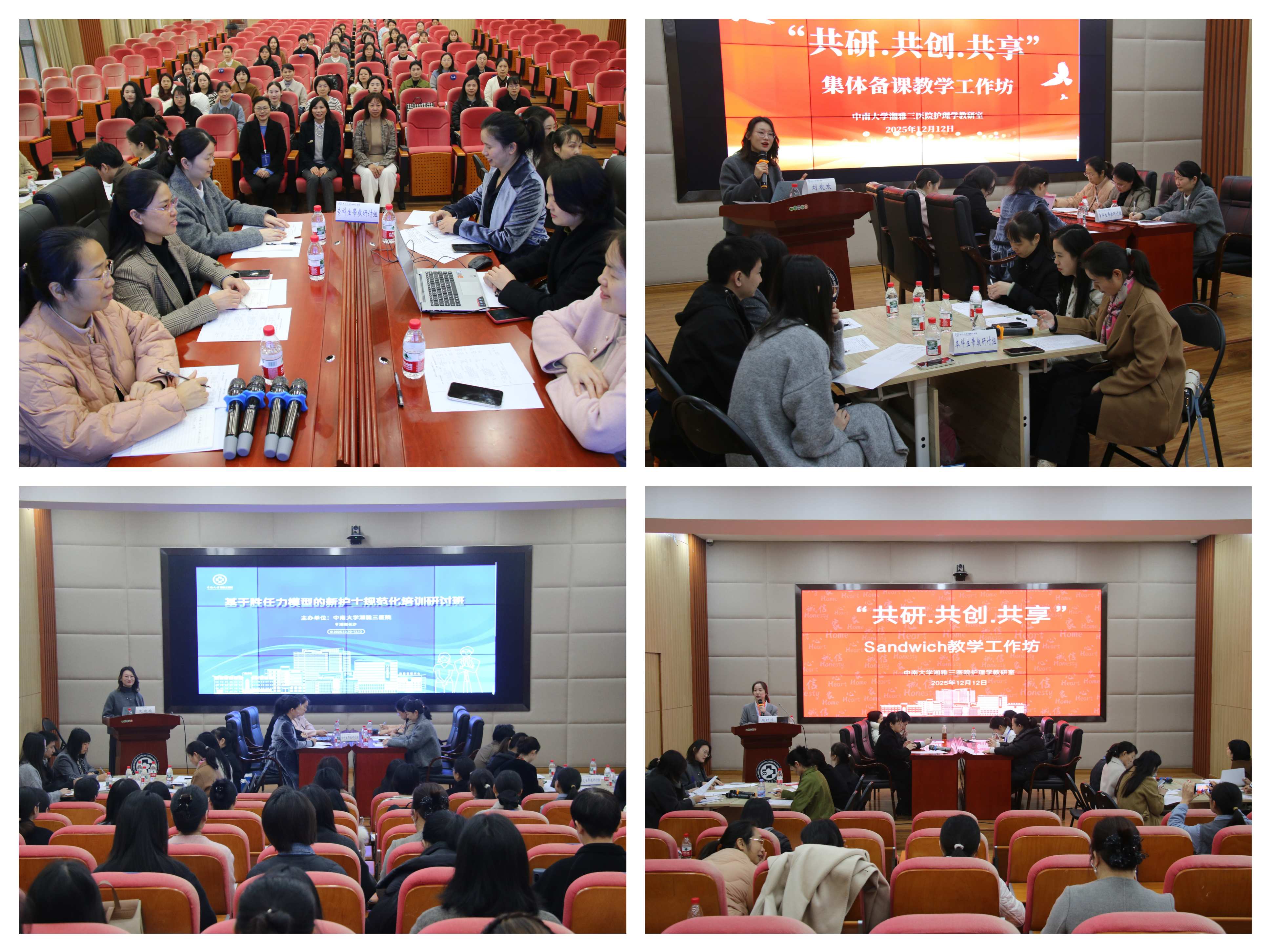 12日,研讨班进入深度互动与实践转化环节,为提升学员的规范化培训实践能力,特别设置了“共研、共创、共享沉浸式集体备课教学”与“多学科协作的Sandwich教学法在护理查房中的创新应用”两场工作坊。在 “集体备课教学工作坊” 中,与会者以小组为单位,针对不同学历层次的护理实习生设计实践教学计划。通过头脑风暴、案例讨论与教案共创,不仅分享了各医院在实践教学计划设计方面的经验,更促进了不同视角的融合,形成了更具科学性、系统性与可操作性的分层实践教学方案,实现了从理论模型到教学实践的初步跨越。随后的 “Sandwich多学科团队护理教学工作坊” ,则生动模拟了临床多学科协作场景。参与者被随机分为不同专业背景的小组,围绕一例终末期肾脏病患者分别从肾内专科、血液净化专科、移植专科等三个不同的专业视角进行分析与规划,再进行跨组讨论与整合。这种“穿插-反馈-整合”(Sandwich)式的互动模式,极大地促进了参与者对多学科团队合作内涵的理解,锻炼了沟通协调与共同决策的能力。工作坊现场讨论热烈,观点碰撞不断,生动展现了以患者为中心的多学科团队协作模式在提升护理质量与患者安全中的核心作用,也为如何在培训中嵌入团队合作引导下的新护士岗位胜任力培养提供了直观范例。