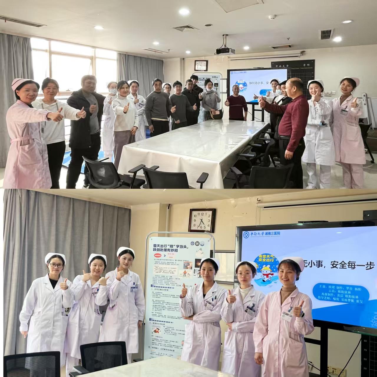 为应对长沙近期雨雪降温天气,保障患者及家属出行安全,中南大学湘雅三医院骨科和放射介入科综合病区于1月14日组织举办了一场以“雨雪天气防滑防跌倒”为主题的患教会。本次活动在护士长喻俊的指导下由总带教易杨梦妮带领娄底职业技术学院护理实习生共同策划开展,通过形式多样的宣教方式,切实提升患者及家属的自我防护能力,获得一致好评。