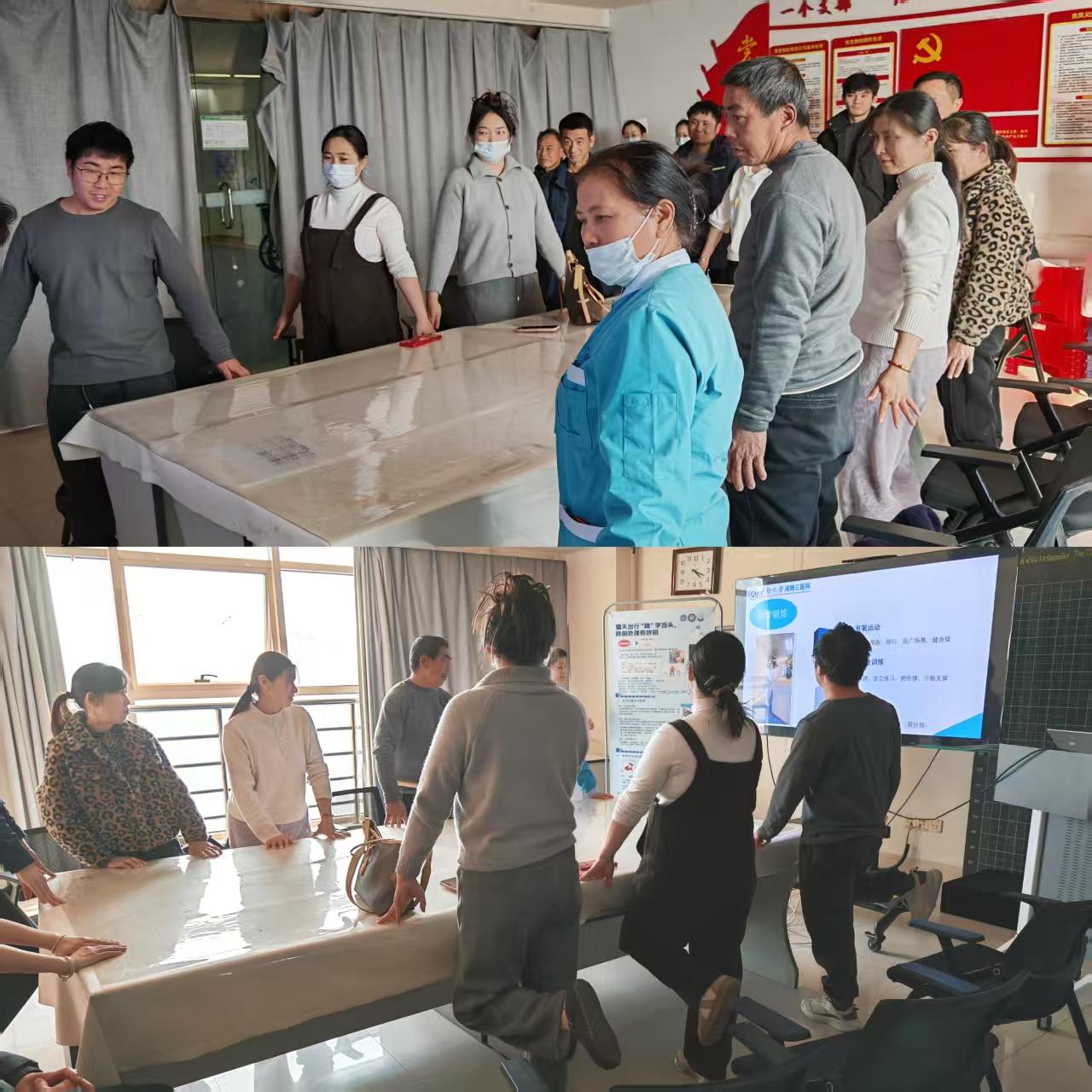 为帮助大家从根源上提升防跌倒能力,活动现场播放了由实习生杨阳、罗佳录制的日常锻炼指导视频,包括踮脚站立、单腿平衡、直线行走等简单易学的动作。患者及家属积极响应,跟随练习,病区气氛活跃融洽。活动还创新性地引入了雨雪天“企鹅步”行走法,通过模仿企鹅降低重心、小步慢行的姿态,提升步态稳定性,生动形象的演示带来了阵阵笑声。此外,欧阳依林现场示范了“正确跌倒”的自我保护姿势,帮助大家在轻松氛围中掌握减轻损伤的方法。