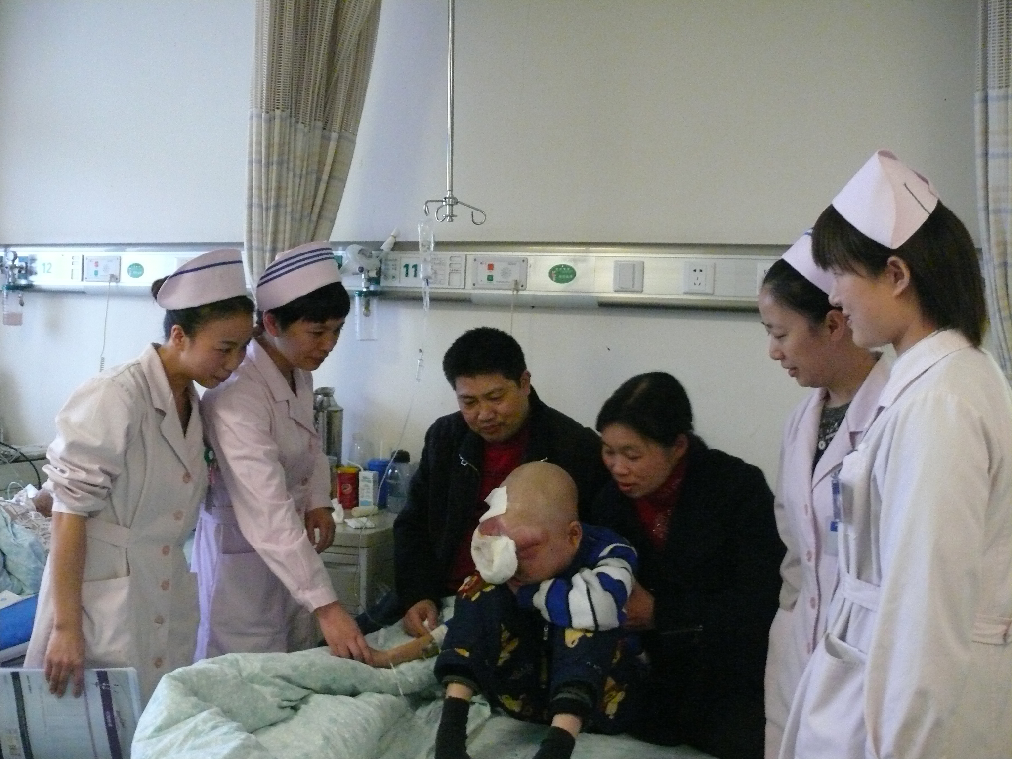 IV Team成员听说了小佳成的情况后,立即向护理部汇报,经护理部决定在IT Team(静脉输液小组)的赞助下,由副组长邓琛护士长及组员晏春丽为小佳成顺利植入了静脉PICC导管。该导管可留置一年,完全解决了小佳成治疗过程中的穿刺难与药物对外周血管损伤的问题,大大减轻了患儿的痛苦。其实这次因为面部肿瘤的生长及浸润,小佳成的面部轮廓已看不清楚,眼睑肿胀厉害以致视物模糊,但PICC置管术顺利完成后,他还是费力地掰开肿胀的眼睑,要看清给予他爱、减轻他痛苦的人们,在场的每个人无不为之动容。