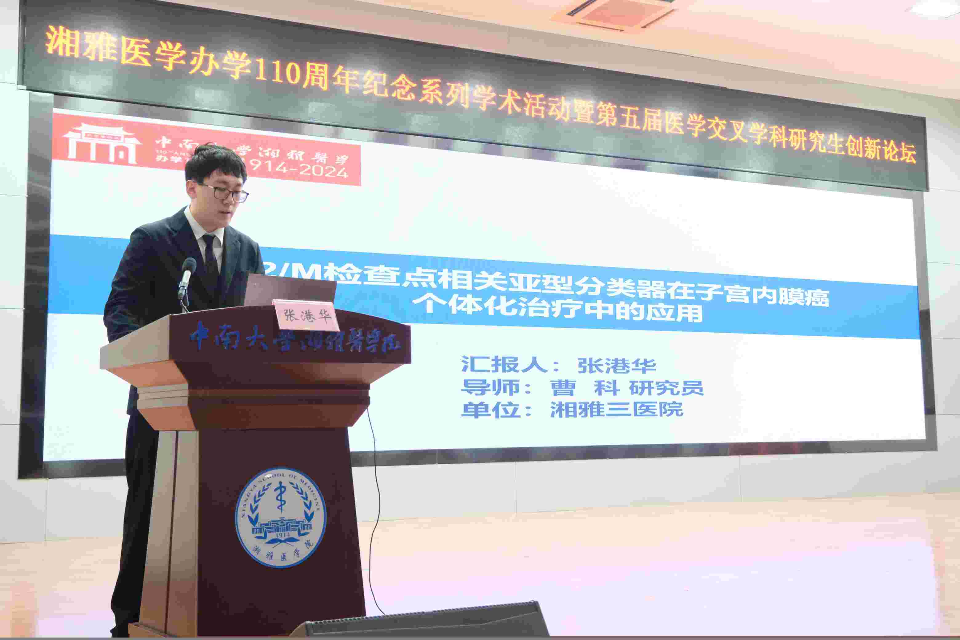 张港华博士(导师:曹科教授)在本次创新论坛比赛的口头汇报中获得三等奖,其精彩的汇报赢得了在场观众的热烈掌声。特别值得一提的是,湘雅三医院副院长曹科因其在指导学生方面的贡献,被授予优秀指导教师奖。