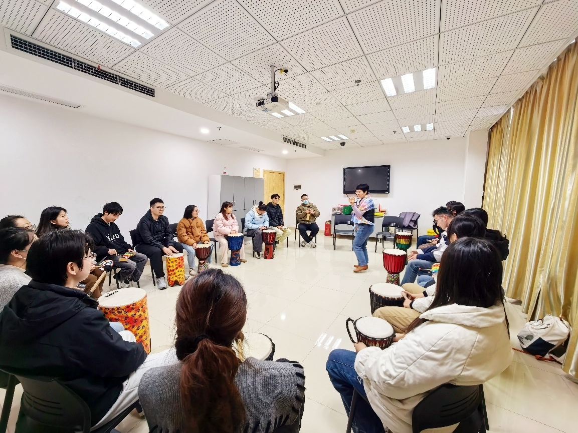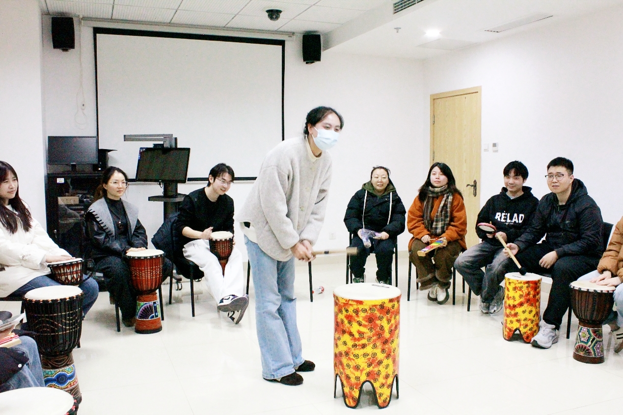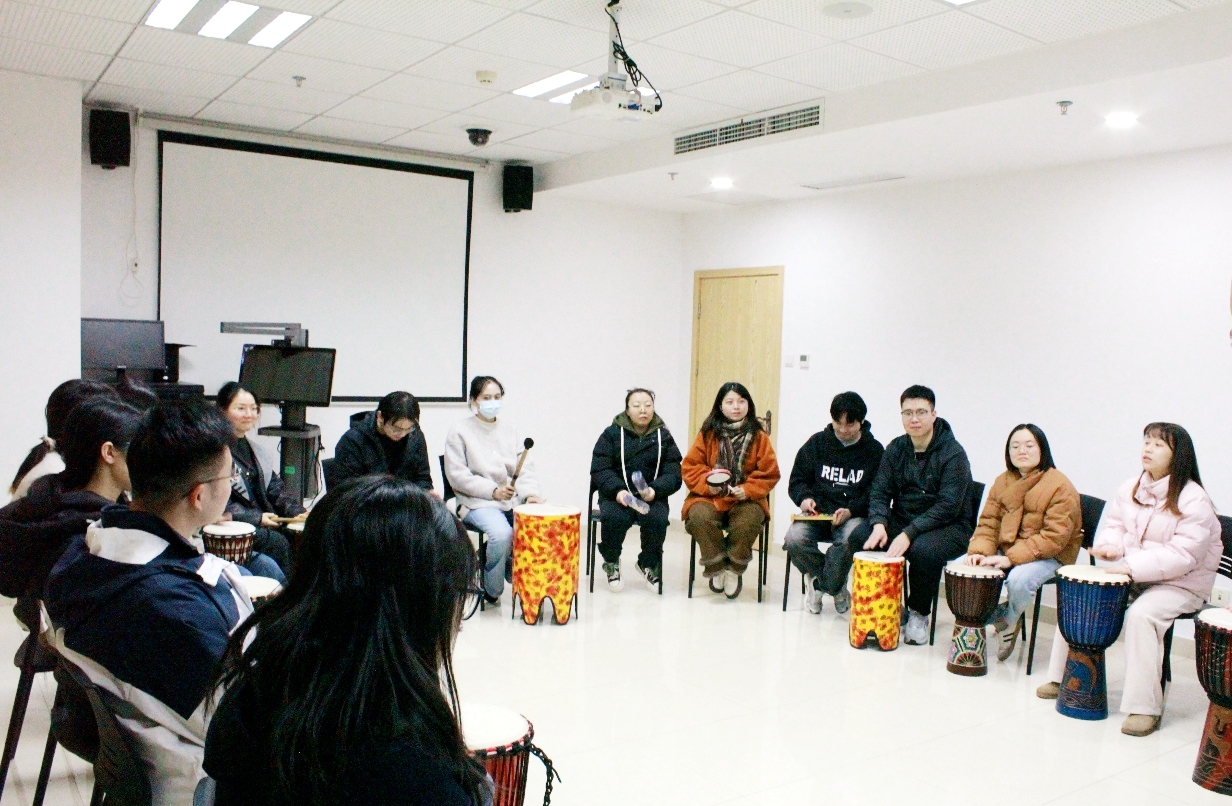 本次活动以“《拥抱幸福》节奏共融・舞动青春”为核心主线,创新将音乐律动、趣味互动与心理学专业知识巧妙融合,特别邀请专业心理咨询师全程带领,通过“鼓圈” 这一生动鲜活的形式,让同学们在节奏共鸣中遇见彼此,在悠扬旋律中释放压力,在协作配合中凝聚团队力量。
