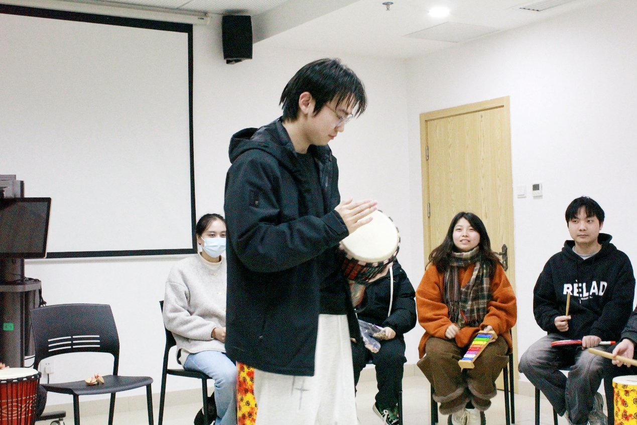 进入整合阶段,经典民乐《喜洋洋》的欢快旋律悠扬响起,同学们将散响乐器、木质乐器、金属乐器与鼓类乐器有机搭配、混合演奏,在沉浸式的节奏体验中渐入“心流” 状态,实现了身心的双重放松。活动尾声,每位同学都踊跃分享了自己的参与感悟与收获,随后全体人员合影留念,用镜头定格下这段温馨美好的时光。