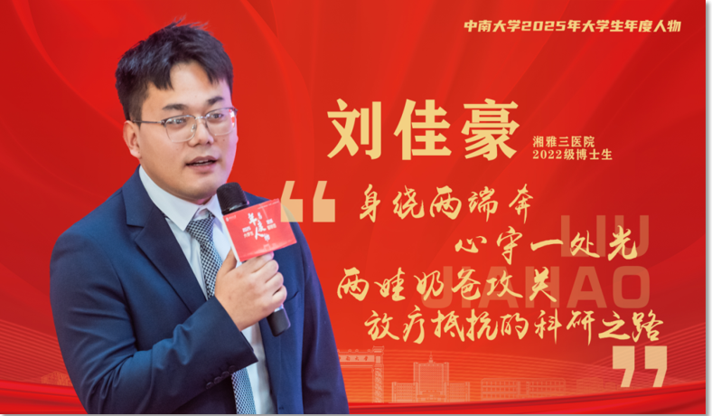 2022级放射影像学博士研究生刘佳豪,在容鹏飞教授的悉心指导下,深耕肿瘤放疗抵抗机制研究,以一作身份在Drug resistance updates等国际顶级期刊发表SCI论文9篇(最高影响因子24.3,Q1区8篇,总影响因子99.3),授权发明专利2项,在肿瘤放疗抵抗与精准治疗方向取得的代表性成果被广泛应用报导。于2025年度凭借其卓越的综合实力,斩获——中南大学“大学生年度人物”称号、中南大学优秀学生标兵与中南大学研究生国家奖学金等重磅荣誉。中南大学“大学生年度人物”作为学校学生评优的最高荣誉,旨在树立可学可做的青年榜样。刘佳豪能够获此殊荣,不仅是对其前沿科研成果的肯定,更是对其在思想品格、社会责任与全面发展上的高度认可,生动诠释了新时代医学生的担当。