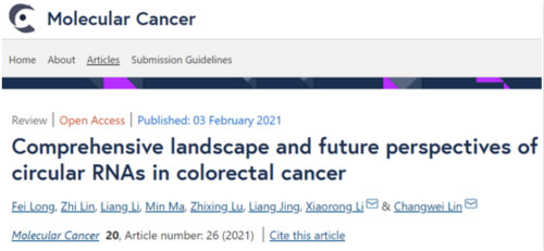 2021年2月3日,中南大学湘雅三医院胃肠外科李小荣教授团队在《Molecular Cancer》(2019 IF: 15.302)上发表题为“Comprehensive landscape and future perspectives of circular RNAs in colorectal cancer”的高质量论文。胃肠外科李小荣教授和林昌伟主治医师为该文共同通讯作者,2018级博士研究生龙飞为第一作者,中南大学湘雅三医院为第一单位。该论文系统阐述了环状RNAs(circular RNAs, circRNAs)在结直肠癌中的研究进展和应用前景。