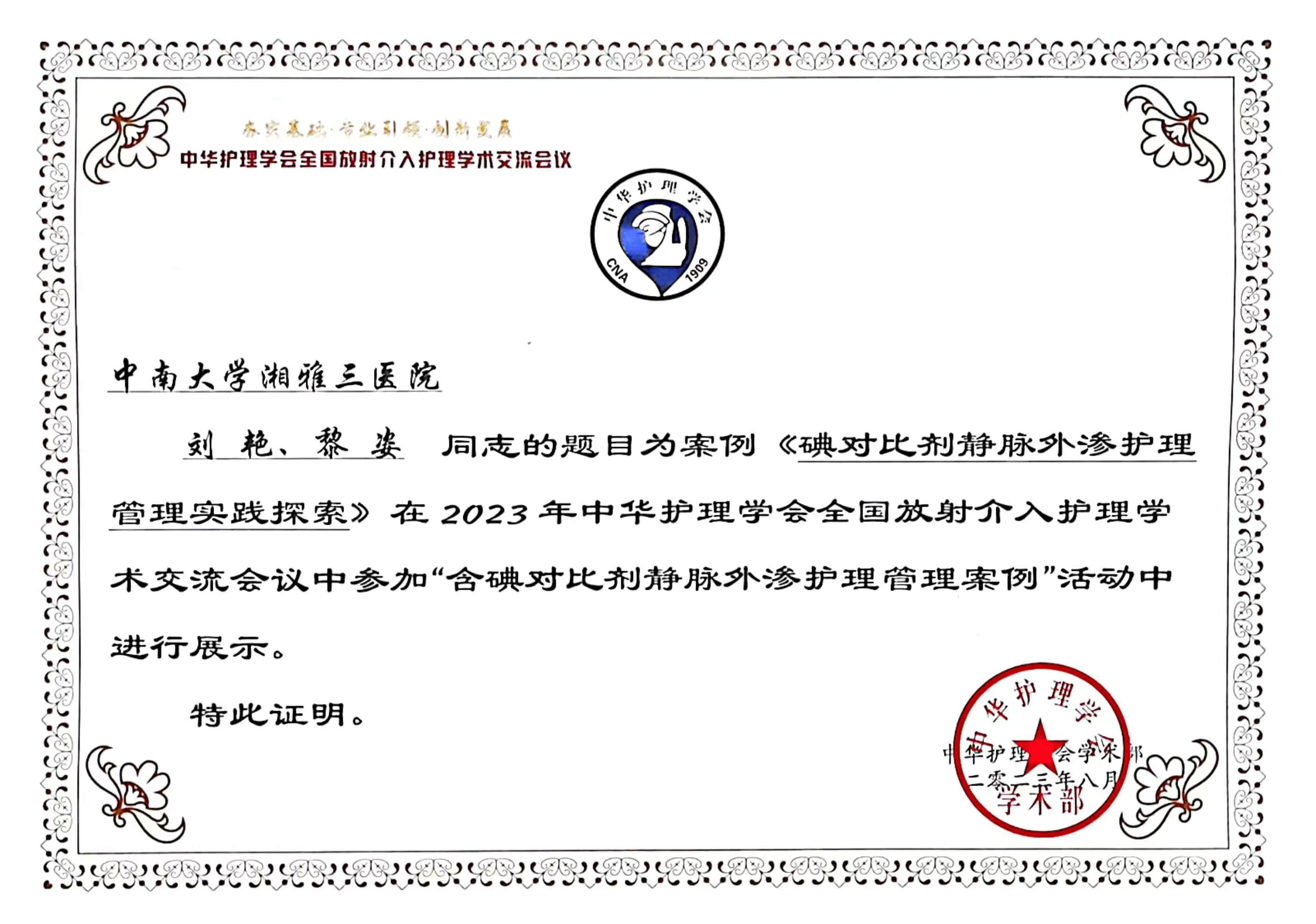 中南大学湘雅三医院放射科黎姿主管护师参加了本次会议举行的全国首届含碘对比剂静脉外渗护理管理案例的展示活动,她以《碘对比剂静脉外渗的护理管理实践探索》为题发表了精彩的演讲,将医院放射科碘对比剂静脉外渗的护理管理经验从多层次、多角度地展现在全国同行面前,受到现场专家的高度评价和认可,体现了湘雅三医院放射科护理人员扎实的业务能力和深厚的管理水平。