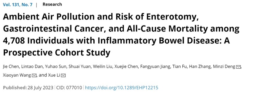近日,中南大学湘雅三医院消化内科副主任技师邓敏子、教授王晓艳联合浙江大学公共卫生学院教授李雪以共同通讯作者在公共卫生与环境卫生领域的顶级期刊《Environmental Health Perspectives》(影响因子10.4,JCR1区)发表了最新研究成果《4,708名炎症性肠病患者的环境空气污染和肠切开术、胃肠道癌症和全因死亡率风险:一项前瞻性队列研究》(Ambient Air Pollution and Risk of Enterotomy, Gastrointestinal Cancer, and All-Cause Mortality among 4,708 Individuals with Inflammatory Bowel Disease: A Prospective Cohort Study),揭示并量化了四种常见的空气污染物对于IBD患者中长期预后的影响。本课题得到国家自然科学基金和湖南省重点研发项目的资助。
