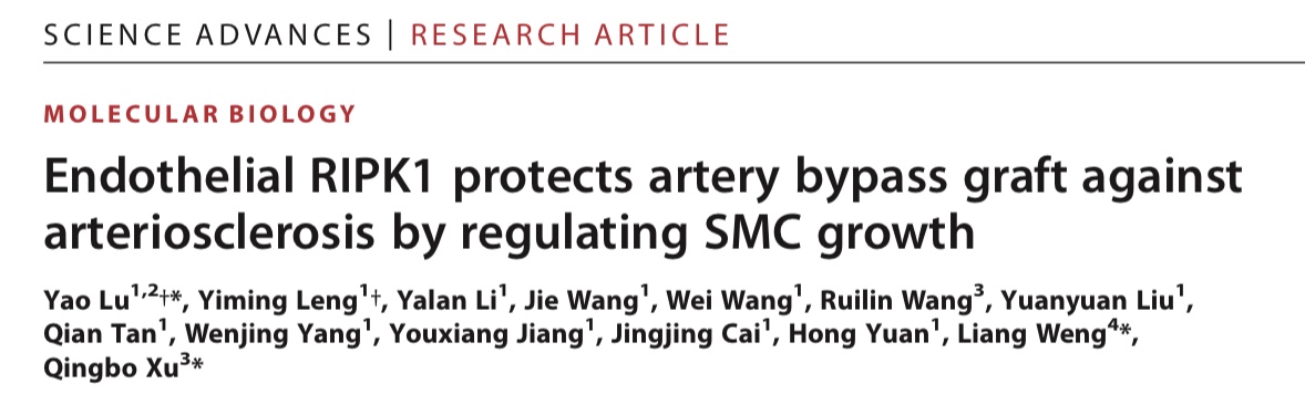 近期,中南大学湘雅三医院陆瑶教授与特聘教授徐清波教授在搭桥动脉重构方面获得重大突破,研究成果以原创性论著形式发表在国际权威期刊《科学·进展》(Science advances,IF:13.6),题目为“内皮细胞RIPK1通过调节平滑肌细胞增殖抑制搭桥动脉重构”(Endothelial RIPK1 Protects Artery Bypass Graft Against Arteriosclerosis by Regulating SMC Growth)。湘雅三医院陆瑶教授为研究的第一及通讯作者(并列),徐清波教授为并列通讯作者,湘雅三医院冷一铭博士为文章共同第一作者。中南大学湘雅三医院为该论文的第一及通讯单位。研究得到了袁洪、蔡菁菁教授的大力支持;并受到国家自然科学基金、国家重点研发计划、湖南省杰出青年、医院汇智育才等资助。
