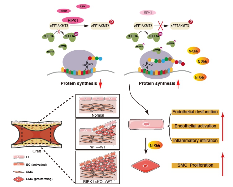 搭桥动脉粥样硬化及再狭窄是严重制约冠心病患者远期生存率的关键临床问题,迫切需要有效的措施改善或延缓搭桥血管狭窄的形成。寻找直接靶向内皮细胞死亡和炎症的调控因子,有望在内皮功能损伤早期进行干预,突破当前动脉搭桥慢性血管重构防治的瓶颈。本研究中通过双套管小鼠自体动脉搭桥手术模型、细胞因子芯片、蛋白磷酸化质谱等技术首次展现了动脉搭桥手术后搭桥血管发生平滑肌细胞异常增殖和再狭窄的动态发展和炎症改变;突破性的发现内皮RIPK1通过Ser26位点磷酸化EEF1AKMT3并调节Sonic hedgehog信号蛋白N-Shh合成分泌,继而通过内皮-平滑肌细胞通讯调控平滑肌细胞异常增殖和搭桥血管重构。局部靶向抑制Sonic hedgehog信号通路有望为预防搭桥动脉粥样硬化及再狭窄提供全新思路。