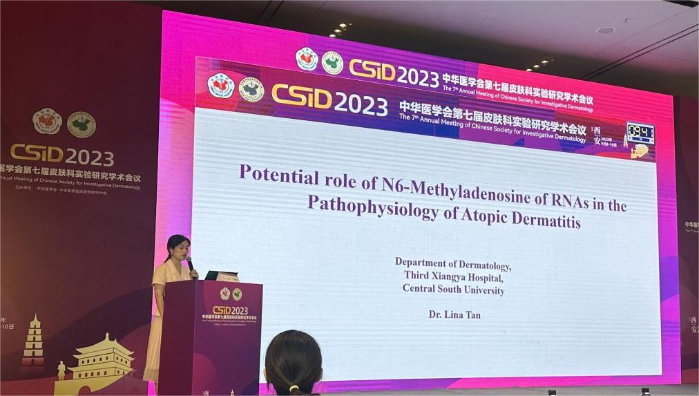 曾金容副研究员代表鲁建云教授就以代谢特征驱动的皮肤色素性疾病如黑棘皮病进行了题为《Clinical factors associated with remission of obese acanthosis nigricans after bariatric surgery》的主题报告,报告中提到在前期的前瞻性队列研究中,通过患者临床特点、生化指标和皮损特点等分别揭示了肥胖相关型黑棘皮病患者术前术后的代谢及病理改变,并提出胰岛素水平及睾酮水平等激素代谢失代偿可能是肥胖相关型黑棘皮病皮损形成的重要驱动因素,这一全新观点的提出为肥胖相关型黑棘皮病的机制研究提供了重要临床线索。谭丽娜副主任及曾金容副研究员代表特应性皮炎研究小组分别做了题为《Potential role of N6-Methyladenosine of RNAs in the Pathophysiology of Atopic Dermatitis》和《Study on the Role and Mechanism of WTAP-Mediated m6A to Promote ALOX15 Expression in Atopic Dermatitis》的学术报告,汇报了团队近期关于特应性皮炎的主要研究成果,两场主题报告分别汇报了特应性皮炎皮损中表观遗传修饰m6A诱导皮肤屏障功能障碍、脂质代谢异常的深入机制研究,报告得到了会场多位专家的一致好评。