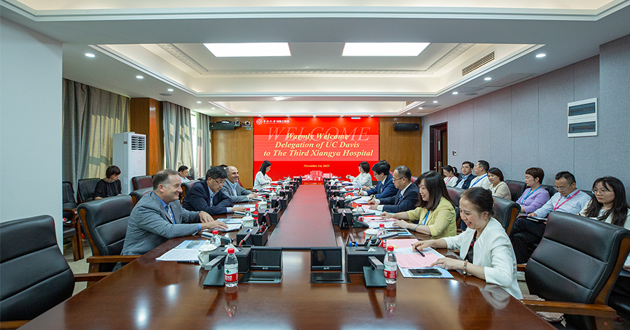 江泓首先代表医院对加州大学戴维斯分校医学中心专家团表示欢迎,他从历史沿革、临床特色、科研教学和国际交流四方面向专家们介绍了医院的基本情况。他表示,“科学无国界”,全世界的医务工作者应携手并肩,共筑“人类卫生健康共同体”。中南大学湘雅三医院高度重视国际学术合作与交流,建院34年以来,与美国耶鲁大学、匹兹堡大学、南加州大学等著名院校建立了长期友好的合作关系,同时也选派了十余名临床医生和博士研究生赴加州大学戴维斯分校研修、留学。加州大学戴维斯分校被誉为美国“公立常春藤”,戴维斯分校医学中心以其卓越的教育、科研和临床服务而闻名于世。他希望能以专家团此次访问为契机,促成双方在医学科研、临床新技术、访学进修、博士后培养等方面的深度合作。