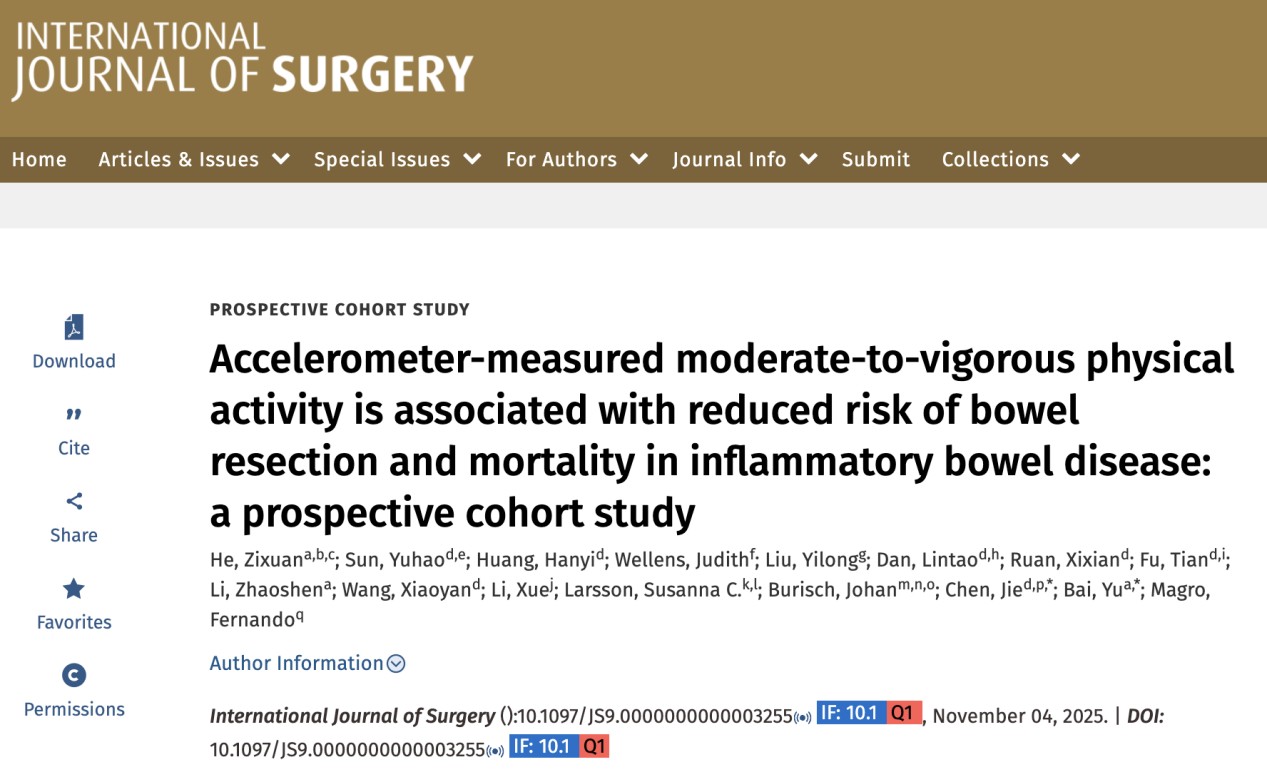 2025年11月,中南大学湘雅三医院消化内科王晓艳教授/陈杰副教授团队携手海军军医大学长海医院柏愚教授团队于国际外科学权威期刊《International Journal of Surgery》(国际外科学杂志,IF=10.1) 发表原创性研究论文《Accelerometer-measured moderate-to-vigorous physical activity is associated with reduced risk of bowel resection and mortality in inflammatory bowel disease: a prospective cohort study》(加速度计测量的中度至剧烈体力活动与炎症性肠病患者肠切除风险和死亡率的降低有关:一项前瞻性队列研究),首次系统揭示了加速度计客观测量的中高强度体力活动对炎症性肠病(IBD)预后的作用,为IBD的运动干预提供了高质量证据。