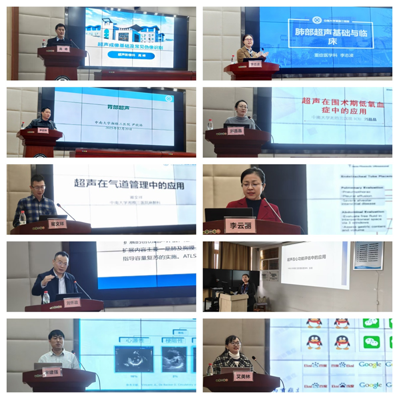 三期培训班还邀请了郑大附一附属郑州市中心医院宋建强、中南大学湘雅医院艾美林、湘雅三医院高峰、刘怀政、李志凌、刘晶晶、彭玥、廖琴、李云丽、尹欣林、唐永忠等多位专家进行理论授课。内容涵盖了超声的基本原理与技术、肺超、心超、颅脑超声、胃超、E-fast评估、临床科研等方面。
