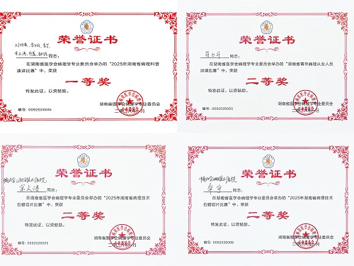 此次在湖南省病理学学术年会上的优异表现,是对湘雅三医院病理科技术组高质量、高标准、高要求的工作的肯定和鼓励,是湘雅三医院病理科团队协作、锐意进取的缩影。科室始终坚持“为病寻理、尚学精医”的科训,高度重视人才培养和学科建设,鼓励团队成员在交流竞技中提升专业能力。病理科将以此次获奖为契机,继续秉承“严谨、求精、创新、育人”的湘雅精神,不断锤炼病理诊断的“火眼金睛”,提升病理规范标准化技术流程,为临床提供更精准的诊断依据,为广大患者的健康保驾护航。