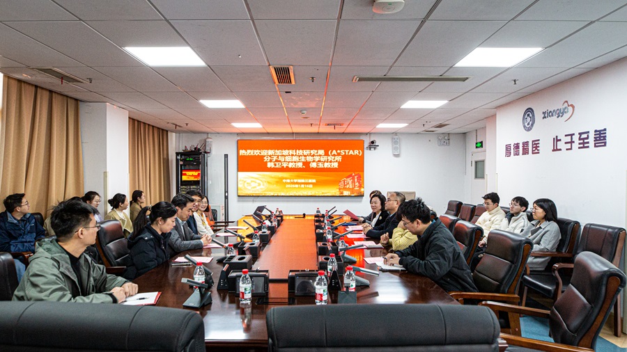 1月16日上午,“新湘雅”国际学术交流会在中南大学湘雅三医院外科楼19楼会议室举行。新加坡科技研究局(A*STAR)分子与细胞生物学研究所杰出首席科学家韩卫平教授、神经科学部主任傅玉教授应邀来院进行学术访问与交流。湘雅三医院院长江泓、副院长左笑丛出席会议,江院长致辞,医院国际合作与交流办、学科建设与规划办公室、科研部、教务部等职能部门负责人、临床医务人员代表和学生代表参会。