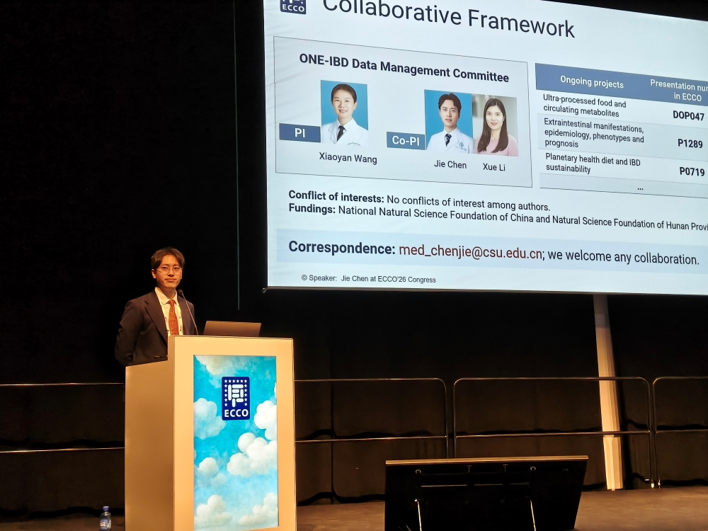 北京时间2026年2月18日,2026年欧洲克罗恩病和结肠炎组织(ECCO)年会拉开序幕。湘雅三医院消化内科王晓艳教授/陈杰副教授团队多项研究集中亮相,覆盖大会开场报告、重点口头报告及大会亮点环节,系统性地展示了该团队在炎症性肠病(IBD)环境风险、遗传机制及精准防治领域的最新进展。其中,六项口头报告研究以团队自主建设的多中心专病队列——IBD多组学、营养与环境队列(ONE-IBD Study)为核心平台,整合中国人群专病队列、医保数据及国际队列,共同构成一幅从队列建设到暴露识别、机制拆解到精准分层与可干预靶点的研究版图,并锁定可测量、可干预的靶点与路径,为IBD的预防与管理带来全新视角。