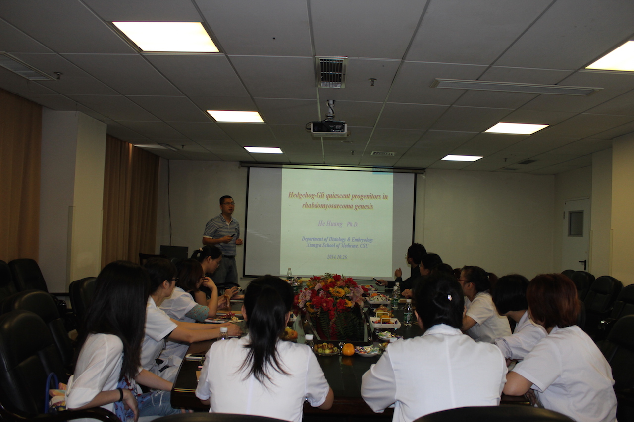 10月26日上午,湘雅三医院青年科协邀请基础医学院青科协学术部部长、组织学与胚胎学系黄河副教授在外科楼十九楼移植科会议室做了题为《Hedgehog-Gli在横纹肌肉瘤形成中的作用》的学术报告。我院青科协执行主席彭程、科研项目部部长唐岸柳与来自各科室的年轻医生们参与了此次活动。