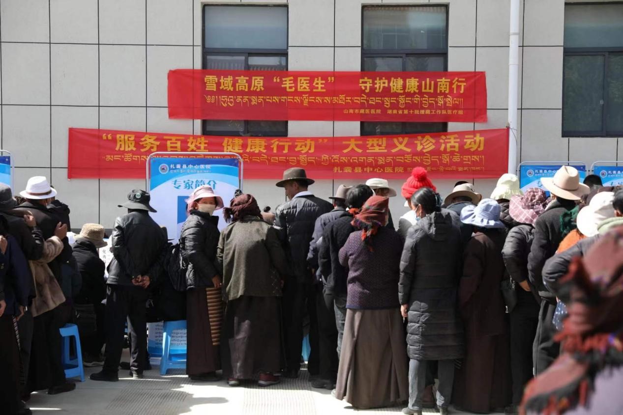 “毛医生”是省政府、省卫健委对湖南援藏援疆医生的统称。按照第十批援藏工作队医疗组制定的“雪域高原‘毛医生’,守护健康山南行”系列方案,值此入驻山南满月之际,第一期大型义诊活动于2024年3月30日举行。医院援藏医疗队员刘少俊副主任医师所在工作队联合山南市藏医医院,赴扎囊县开展的“党的光辉照边疆,湖南援藏谱华章”医疗援藏“毛医生”下乡义诊活动。