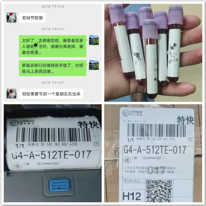 此外,血液科2月初收治了3位初发重型再生障碍性贫血患者,骨髓造血极度衰竭,随时有感染、出血风险,急待行造血干细胞移植。科室立即启动血缘和非血缘供者配型工作,几日后,结果显示仅1位患者找到血缘供者。2月7日、9日,中华骨髓库陆续传来好消息,另外2位患者找到了全相合的非血缘供者。马上就是春节了,供者能否联系上?他们是否同意?能否年前配型、体检?若年后进行,移植将至少延迟10余天,血源紧缺的日子里,每一刻等待对病人来说都是一场生死考验。于是,医生通过电话、微信、电脑系统等多种方式频繁与中华骨髓库总库及分库协调沟通,力争供者年前配型、体检。骨髓库经过多方协调,第一时间与供者取得了联系,所幸两位爱心供者立马同意了捐献,并当日邮寄了配型血样,次日完成了体检。经过医院与配型实验室、物流公司、患者及家属等多方配合,患者在几个小时内即完成了知情同意、血样邮寄、汇款等事宜,配型、体检结果合格后即可进行造血干细胞移植。