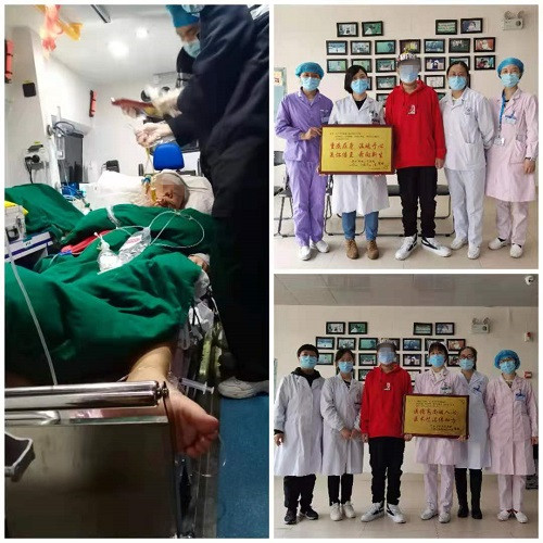 图4:转院时120车上的晓志与康复后分别向呼吸与危重症医学科、血液内科医护团队表达感谢的晓志