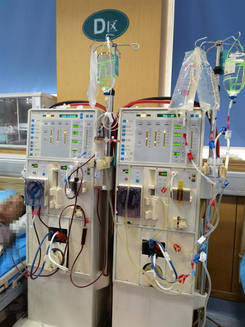 从上午十点开始准备,装机-预充-上机,患者的血液被引出,经膜式血浆滤过器,分离出的血浆经过特殊的蛋白A免疫吸附装置,吸附去除致病性抗体后,净化后的血浆再回输到体内。6个小时的治疗相当于将患者全身的血浆吸附处理了8个循环,第一阶段的治疗顺利结束。