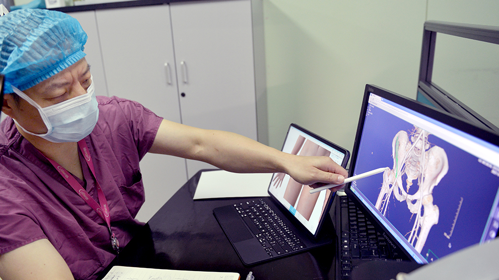 经过对病情的仔细研究,罗令教授团队决定为患者进行髂骨瓣移植保髋治疗。近年来,湘雅三医院骨科在吴松教授及罗令教授的带领下,已开展近百例青壮年股骨颈粉碎骨折及股骨头坏死的保髋治疗手术,带旋髂深血管蒂髂骨瓣移植是一种很有效的治疗方法。但目前开放手术方式存在创伤大,腹壁肌肉破坏后导致肌力下降,股疝及血管解剖显露难等缺点。罗令教授大胆提出采用目前最先进的达芬奇手术机器人为患者进行手术。达芬奇机器人手术主要应用于妇科、泌尿外科、普通外科、心血管外科等领域,在显微骨科领域应用极少,运用到带蒂髂骨瓣移植术的尚属空白。