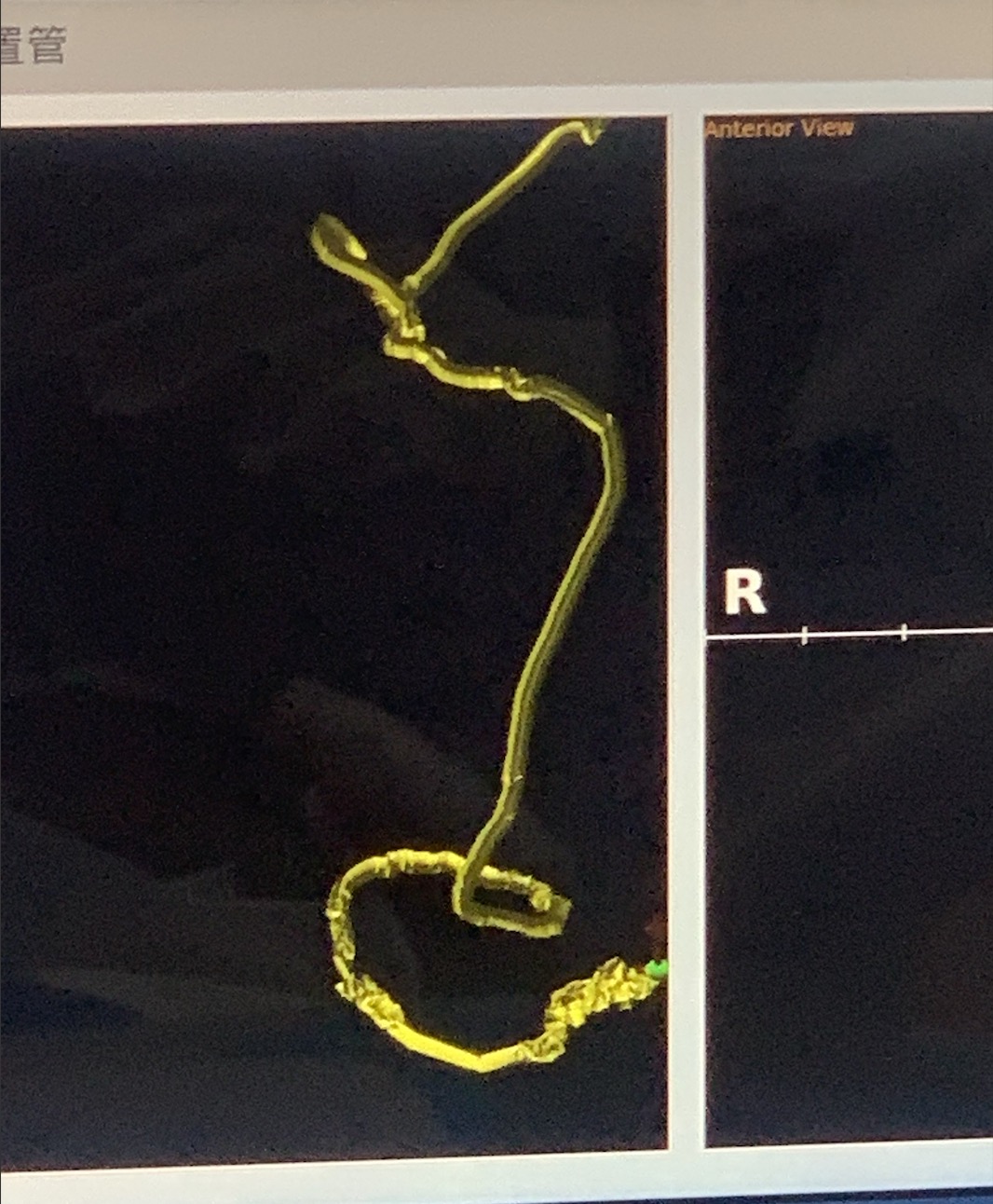 重症患者常因疾病本身和长期卧床等其他因素需要经鼻胃管喂养,而经鼻胃管喂养容易引起吸入性肺炎、返流、胃内液体潴留等风险。针对这类患者,使用鼻肠管的置入非常重要。营养科自2016年起开展了床旁徒手鼻肠管置入术,置管医生凭手感将鼻肠管置入空肠上段,为临床上很多无法进行胃镜下置管的患者开通了生命通路。但该治疗方式有一个弱点,即置管时间较长。而磁导航是通过体外电磁定位导航仪、电磁接收器、内置电磁发射器的金属导丝,将导管的置入路径通过3D动画形式可视化,大大提高了徒手鼻空肠管置入的速度和成功率。