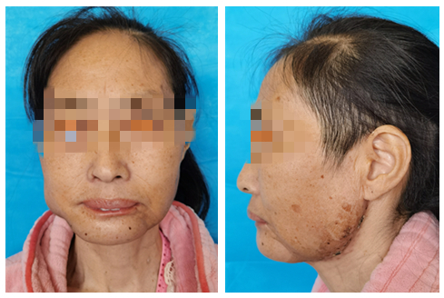 18年前,李女士发现左侧下颌处长出“蚕豆”大小肿块,渐渐的肿块越长越大,李女士在当地医院进行了穿刺治疗,抽取内容物后,肿块几近消退。可未曾想,几天后在相同区域,肿块又再次长了起来。此后,李女士辗转多家医院检查和治疗,并接受了下颌骨肿瘤切除手术,诊断为下颌骨成釉细胞瘤,但术后一年下颌骨肿块又复发了。再后来,李女士因为下颌骨的肿物逐年增大,大大增加了手术的风险和难度,一直没能进行手术。长期的面部变型和疼痛,给李女士生活和心理造成了很大影响。今年10月,李女士家人慕名来到中南大学湘雅三医院口腔科开始进一步诊治。