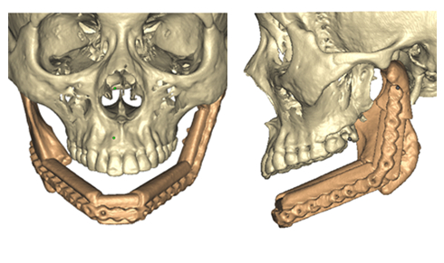 郭新程副教授和卢若煌主治医师为主的治疗团队详细讨论了手术预案,因患者肿物范围巨大,几近侵犯全部下颌骨,查阅文献发现,恶性成釉细胞瘤伴随全身转移的病例非常罕见,在过去100年里,全球大约只报告过不到100例。为此,口腔科开展了疑难病例讨论,为其制定了详细的治疗方案。因为患者为中年女性且手术区域为双侧下颌骨,在切除肿瘤的同时需保证一定的美观和功能。同时,由于患者肿瘤组织巨大且血供丰富,切除难度大,双侧下颌骨切除后缺损长,单侧腓骨重建难度极大,小腿供区制取腓骨瓣困难大,治疗团队实事求是与家属沟通后,全力以赴做好了充足的术前准备,特别是卢若煌医生术前通过大数据分析和数字化手术辅助设计,给患者重新“设计”了一个“新的下颌骨”,为手术的顺利开展提供了重要保障。