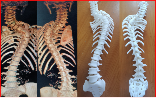 图一 术前三维CT重建及3D模型打印显示上胸椎严重僵硬型先天性脊柱侧凸,多节段分节不全及并肋