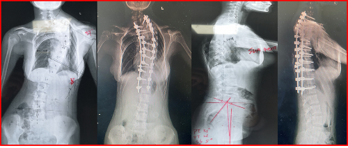 邓幼文及脊柱畸形团队骨干成员王正光主治医师与多位国内顶尖脊柱畸形专家反复论证,为患者制定了一期头环重力牵引+二期多棒内固定-序贯矫形的矫形手术方案。此方案采用分步矫形理念,大大的降低了手术的风险,增加患者对此类手术的耐受能力。患者首先接受了3个月头环-重力牵引,改善肺功能状况。11月9日,脊柱外科主任邓幼文、主治医师王正光为12岁8个月的小许实施了重度脊柱侧凸截骨矫形-多棒系统内固定手术,耗时9个小时。术后侧凸畸形得到明显改善,双肩部平衡,颈部无偏斜,剃刀背畸形基本消失,身高增加6cm,未发生任何神经并发症。