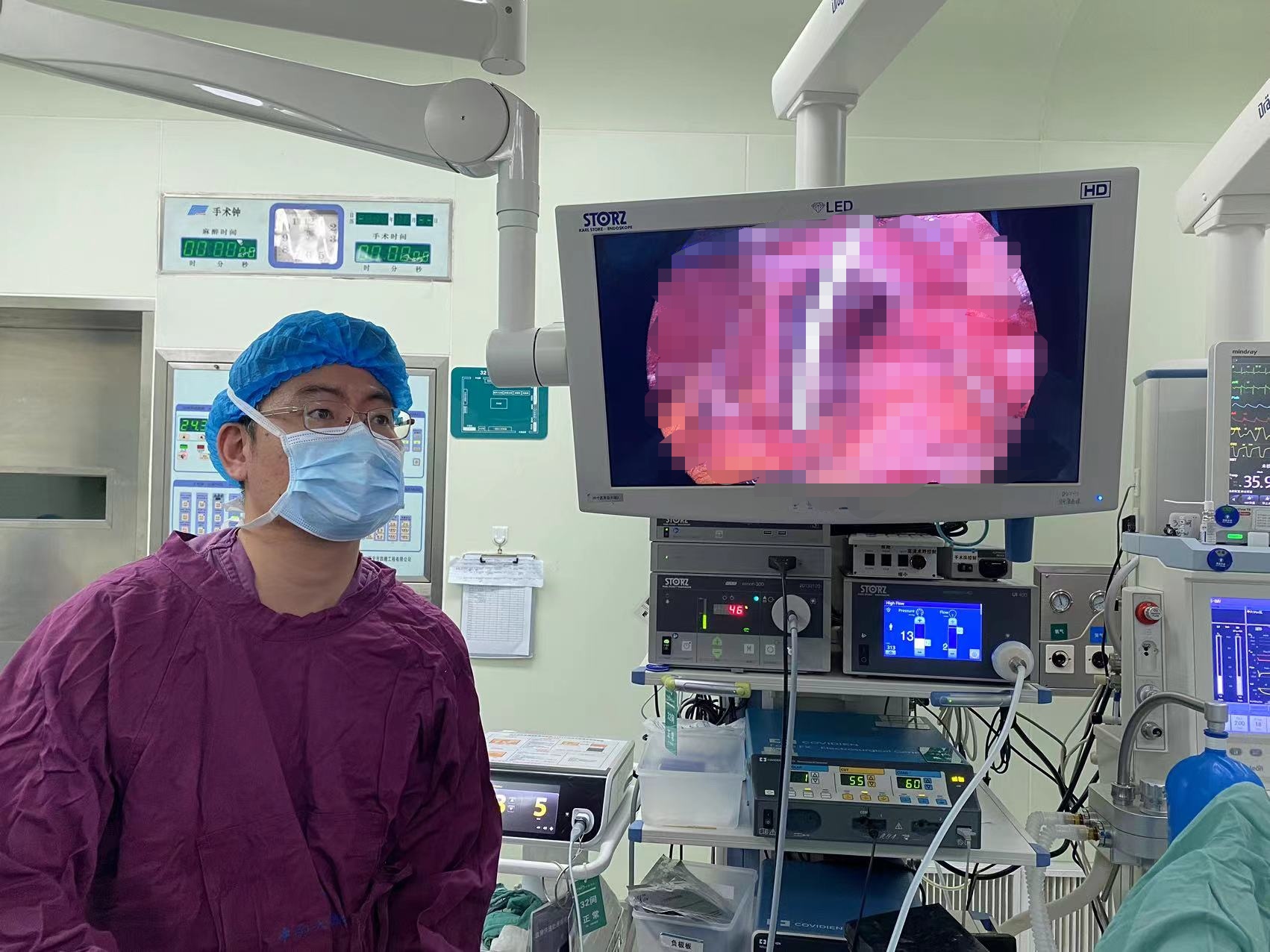 入院后,朱利勇副教授团队为患者完善术前检查,进一步明确其巨大的食管裂孔疝。检查结果显示:患者大部分胃、部分结肠都通过食管裂孔疝入胸腔,腹内脏器进入胸腔的高度几乎高于心脏的上缘,经放射科张声旺副教授计算,其疝囊体积近600ml,而患者整个腹腔体积近3000ml左右,即约五分之一腹腔脏器都进入胸腔内。同时,由于高龄及疝的影响,加之患者合并心动过缓、房性逸搏、室性早搏等诸多心律失常问题,手术操作难度大,麻醉有存在心脏骤停等风险,术后腹腔容积快速增大也有引发腹腔间隔室综合征可能。因此,术前胃肠外科Ⅱ科联合麻醉科、ICU、心内科、影像科、胸外科对患者进行多学科会诊,制备周密方案;在与患者及家属充分沟通手术风险后,于8月7日行手术治疗。