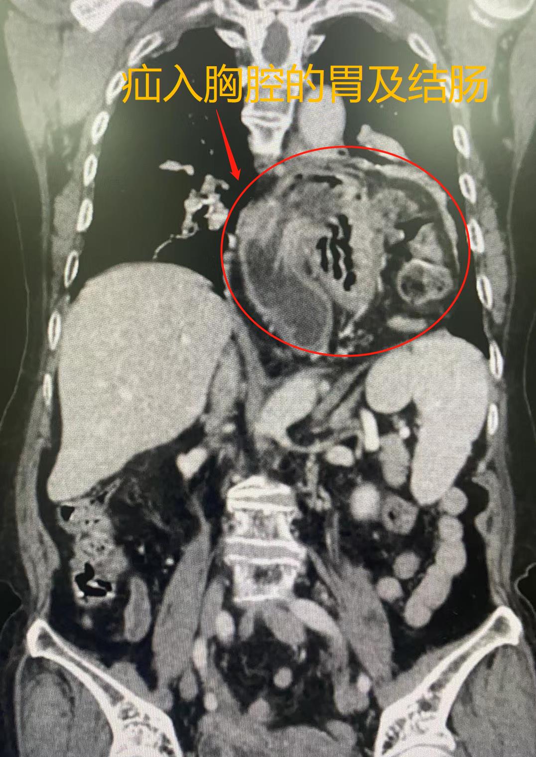 图为患者术前腹部CT显示疝入胸腔的巨大疝囊