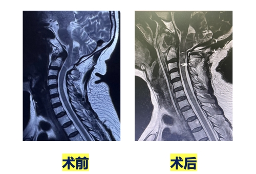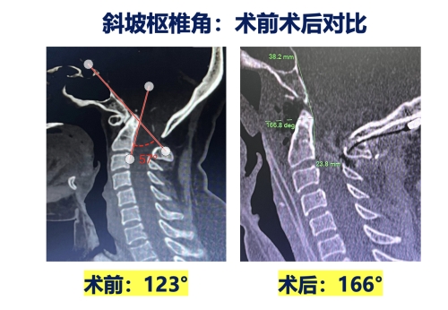 9月22日,由邓幼文主任医师、李劲松副主任医师及彭毅主治医师组成手术团队,在神经电生理监护下为罗阿姨实施手术。团队实现了寰枢关节解剖复位,切除寰椎前弓,超过齿状突的宽度,利用钉板系统强大的复位功能,使齿状突降至寰椎水平,圆满地完成了手术。术后复查影像显示:斜坡枢椎角由术前123°增大到了166°,延髓腹侧压迫完全解除。随着寰椎后弓切除,枕骨相对水平化,就如同一个簸箕兜底将其铲起,小脑扁桃体下疝明显改善。术后罗阿姨双手麻木、颈肩疼痛、行走不稳的症状得到明显缓解。罗阿姨的儿子激动地握住医务人员的手不停表达感谢。