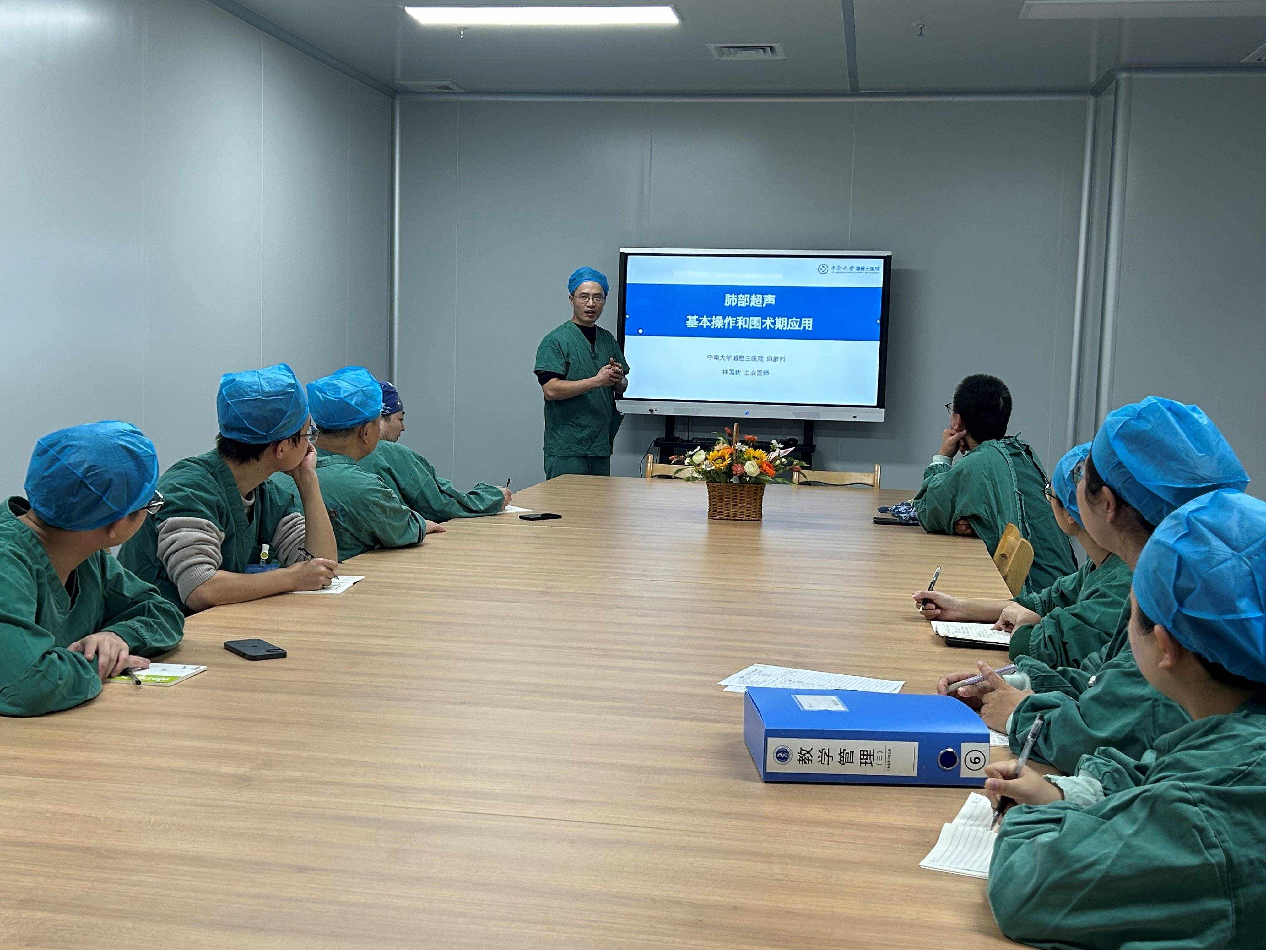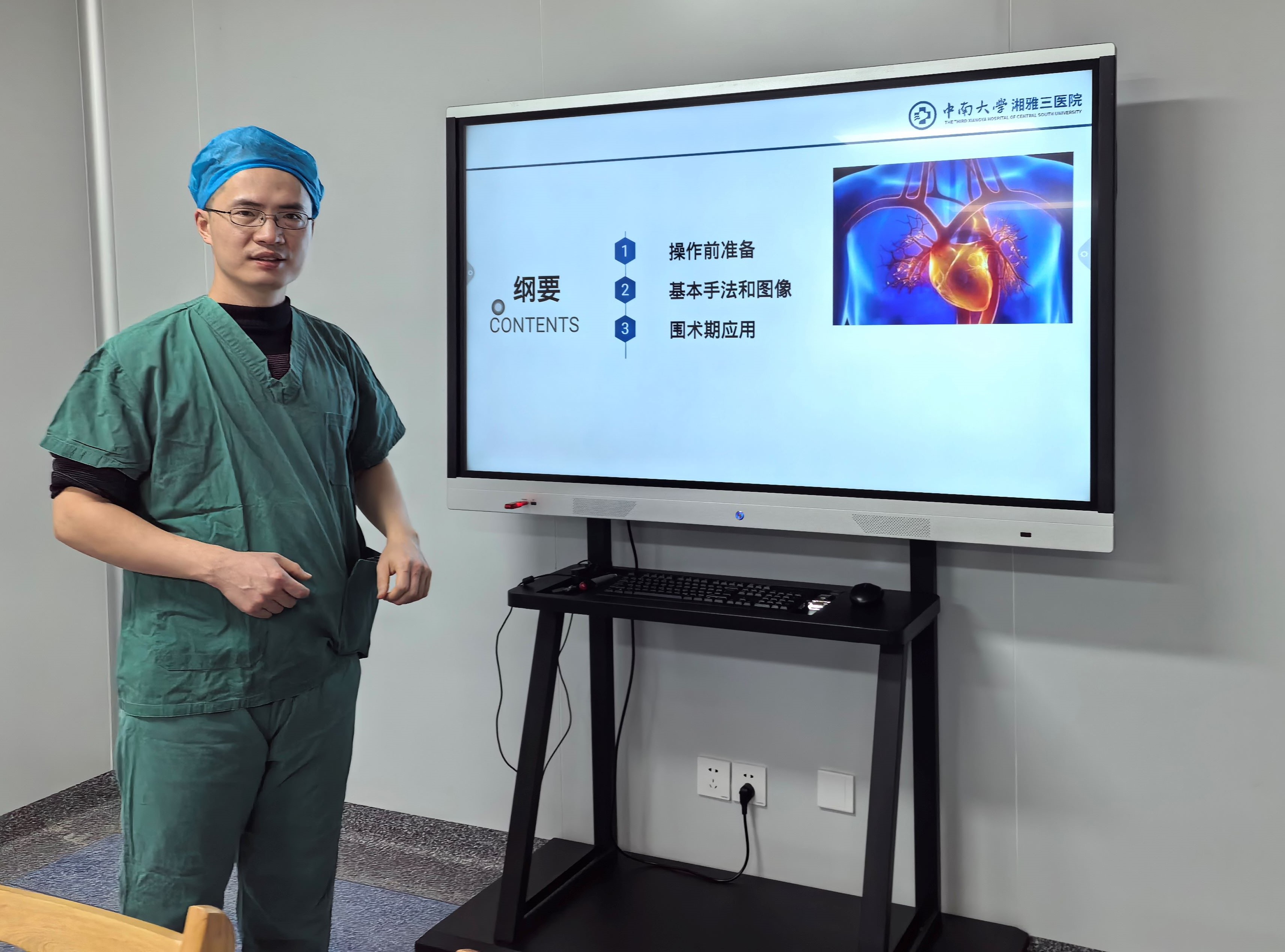 手术中患者的循环状态可能瞬息万变,尤其是急诊、高龄、合并心脏疾病的患者,床旁心肺超声的围术期评估至关重要。它有助于发现潜在的心脏问题,优化患者状态,规避手术风险。在术中或术后出现难以解释的低血压、低血氧或循环衰竭时,它能帮助医生快速诊断原因(如气胸、肺水肿、肺栓塞、急性心梗等),为抢救生命赢得宝贵时间。湘雅三医院麻醉科作为国内围术期超声技术推广的先行者,近年来已多次成功举办国家级继续教育项目——围术期超声诊疗应用技术培训班,此次下乡帮扶医生将这一先进技术与规范化操作引入当地医院,是优质医疗资源下沉的具体实践。他先针对基础理论开展培训,随后开展专题讲座,系统讲解操作流程、优势特点及临床应用场景。