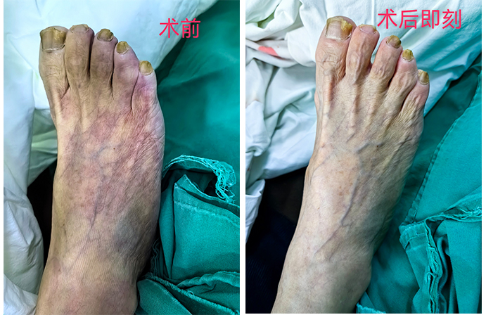 术前下肢缺血症状严重,术后下肢缺血得到了明显改善