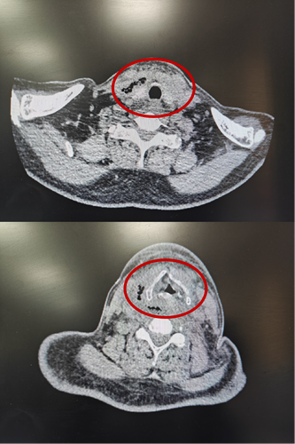 2月15日与20日,当整座城市沉浸在辞旧迎新的欢声笑语中,两位病情凶险的颈部深部脓肿患者先后被推入耳鼻咽喉头颈外科。他们都有多年糖尿病病史,春节期间饮食不规律、作息紊乱、血糖波动大,让原本隐匿的感染如野火般迅速蔓延。其中一位患者的感染已突破颈部间隙,如藤蔓般向下侵入纵隔区域——那里是心脏、大血管、气管的“交通枢纽”,是人体最脆弱的生命禁区之一。CT影像上,脓肿中密布的气腔像一个个危险的信号,气管被严重受压,每一次呼吸都变得艰难。文献数据冰冷而沉重:颈深部脓肿并发下行性纵隔炎,病死率高达40%~70%。时间,从未如此紧迫。