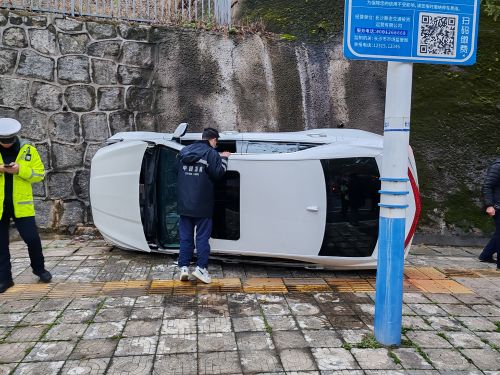 抵达现场时,侧翻的车辆横在人行道上,车身严重变形,现场有交警维持秩序。身着 “中国急救” 制服的医护人员没有丝毫迟疑,立即投入紧张的救援工作。他们分工协作,有的俯身探查车内被困人员的生命体征,有的快速评估现场环境、排除二次伤害隐患,有的准备急救设备随时待命。从靠近车辆到初步处置,每一个动作都娴熟专业,每一个环节都有条不紊,尽显湘雅急救人的专业素养。