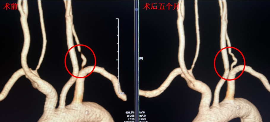 2025年9月24日,神经外科为一名椎动脉重度狭窄患者,成功实施了湖南省首例适应证下的椎动脉重度狭窄合并海绵状血管瘤的“药物球囊扩张术”,术后2天出院。5个月后的2026年2月24日,患者返院完成CTA复查,通过与术前对比发现原狭窄血管得到明显改善,症状缓解。该手术巧妙地规避了传统支架植入后需长期服用双联抗血小板药物(“双抗”)所带来的血管瘤出血风险,为症状性椎动脉狭窄患者创造了更优的介入治疗选择。