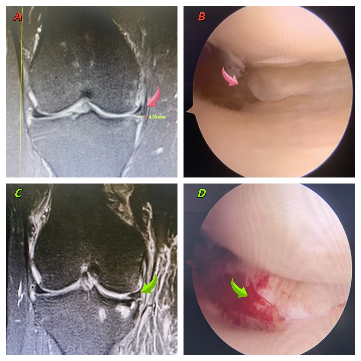 图A 术前MR 箭头示右膝内侧半月板明显被挤出移位约5mm,图B 箭头示半月板根部撕裂