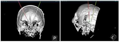 为保障手术安全与疗效,杨靓副教授与雷立芳教授牵头定制个体化手术方案,吴浩主治医生主刀实施手术,罗魁副主任医师全程跟进并负责术后调控,组建起“术前全面评估-术中精准植入-术后个体调控”的全病程诊疗团队。同时,团队运用改良后的机器人手术流程与脑机接口型DBS的结合,术前精准定位,将直径仅1.2毫米的电极植入快速、准确的植入到阿姨脑内目标核团,随后成功为其植入脑机接口脑起搏器。术后首次复查显示,电极位置与预设靶区完全吻合。