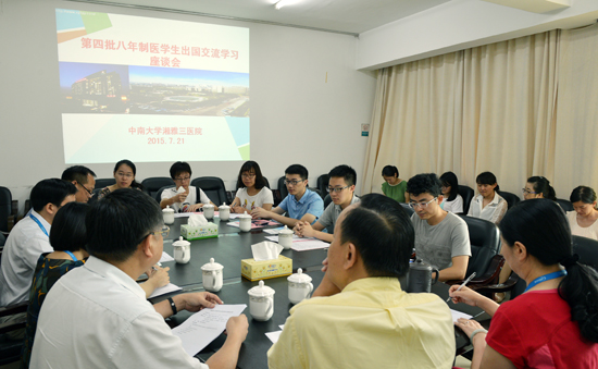 7月21日下午,湘雅三医院资助的第四批八年制医学生赴美留学座谈会在综合楼一会议室举行。我院09级八年制12名同学将赴美国匹兹堡大学交流学习。