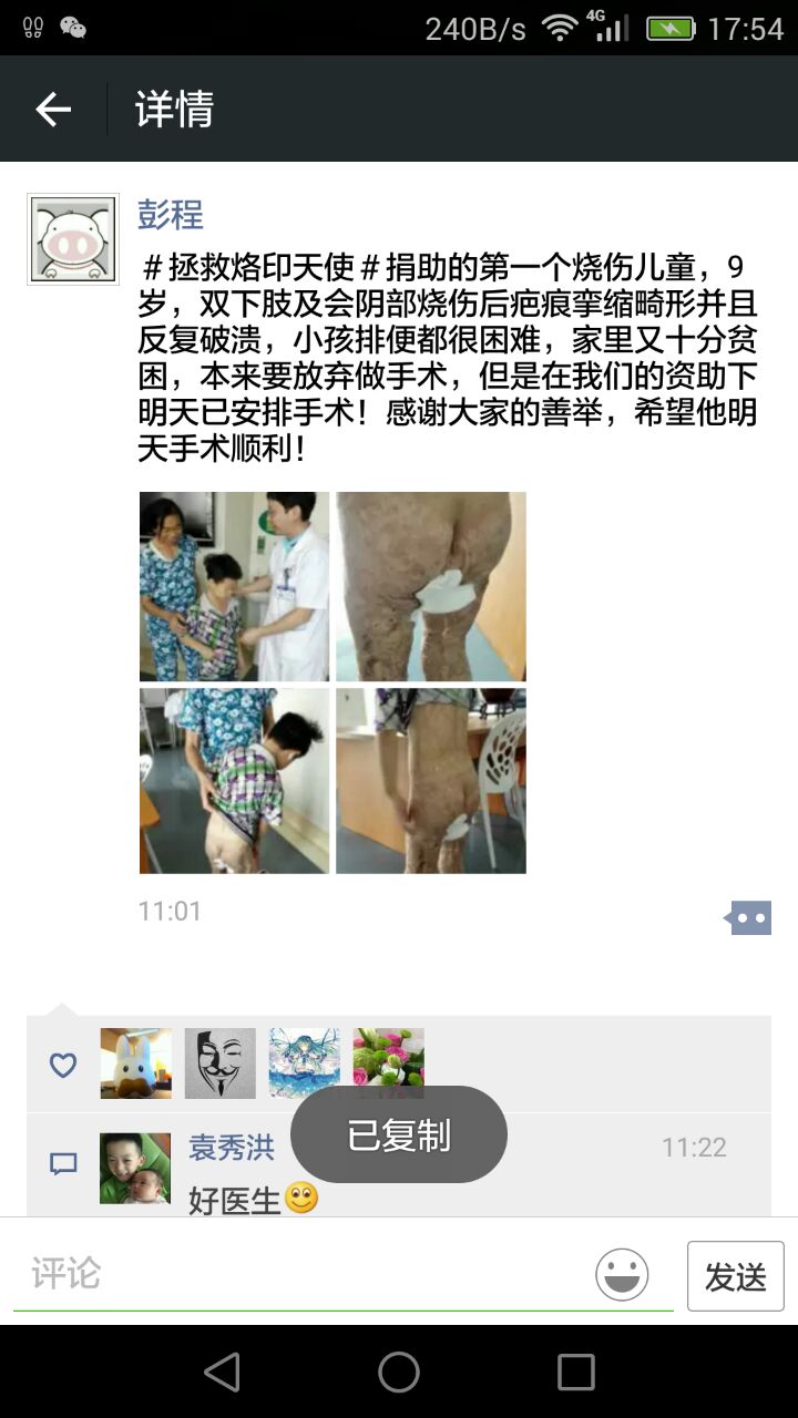 “#拯救烙印天使#捐助的第一个烧伤儿童,9岁,双下肢及会阴部烧伤后疤痕挛缩畸形并且反复破溃,小孩排便都很困难,家里又十分贫困,本来要放弃做手术,但是在我们的资助下明天已安排手术!感谢大家的善举,希望他明天手术顺利!”