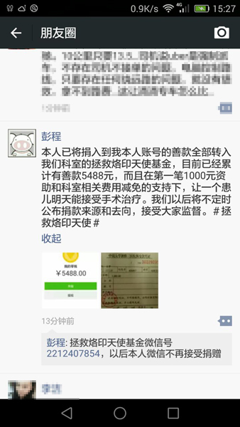 短短1天时间,彭程医生通过微信的朋友圈凑了6000多元。他说,有自己的朋友,有车友,有医院同事,有可怜这些小孩的妈妈们,捐款完全自愿,希望大家凑点钱先垫付一些医疗费,让患者尽快接受正规的治疗。