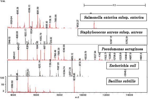 MALDI-TOF质谱技术可以对微生物的多种成分进行分析,包括蛋白质、多肽、脂类、脂多糖(LPS)和DNA分子。该技术包括了以下临床应用:(1)通过每种细菌分离物的生物质谱,得到每种细菌唯一的肽模式或指纹图谱来鉴定细菌。(2)生物质谱通过对细菌体内蛋白质的分析鉴定细菌的属、种、株。采用PMF方法已对酵母、大肠杆菌等多种微生物的蛋白质组进行了研究。对大肠杆菌经膜转印的蛋白质研究表明,三个肽段即可达到对蛋白质的正确识别。(3)串联质谱还可针对脂类的脂肪酸、糖类组成进行鉴定,也可从单细菌水平发现和确定病原菌及孢子。对特殊脂质成分的分析则可了解样本中病原菌的活力和潜在感染。