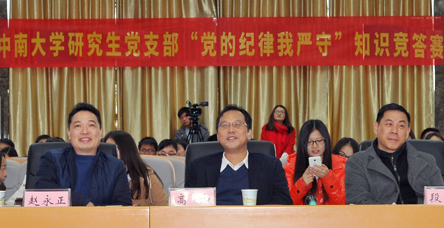 12月9日上午,由中南大学党委研工部和组织部主办的研究生党支部“党的纪律我严守”知识竞赛在机电学院举行决赛,中南大学党委副书记高山、宣传部部长刘建华、组织部副部长罗永忠、研工部部长赵永正、研工部副部长姚勇、学工部副部长李涛出席活动。湘雅三医院研究生代表队经过数轮激烈角逐,挺进决赛,并荣获三等奖。