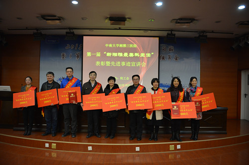 12月18日下午,院工会在外科楼二楼学术报告厅举行了第一届“新湘雅最美科主任”表彰暨先进事迹宣讲会。会议由院党委副书记兼工会主席邓云龙主持,黄进华副院长宣读了表彰决定,与会的院领导为当选的各位科主任进行了颁奖。按照安排,由受奖主任的科室成员对主任的先进事迹进行了宣讲,全院职工代表近两百人参加聆听。