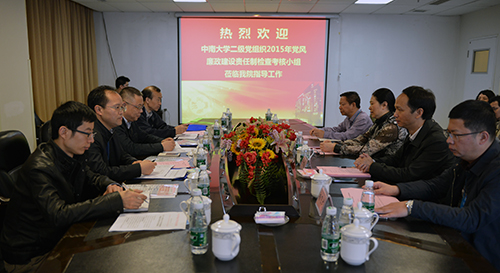 4月22日上午,中南大学党风廉政建设责任制执行情况检查组唐忠阳组长一行4人,按照《关于对二级党组织2015年党风廉政建设责任制执行情况进行检查考核的通知》(中大党纪字[2016]8号)的要求,对我院2015年党风廉政建设责任制执行情况进行检查。院领导罗爱静、吴希林、袁洪、黄进华、杨飞龙接待了检查组一行。
